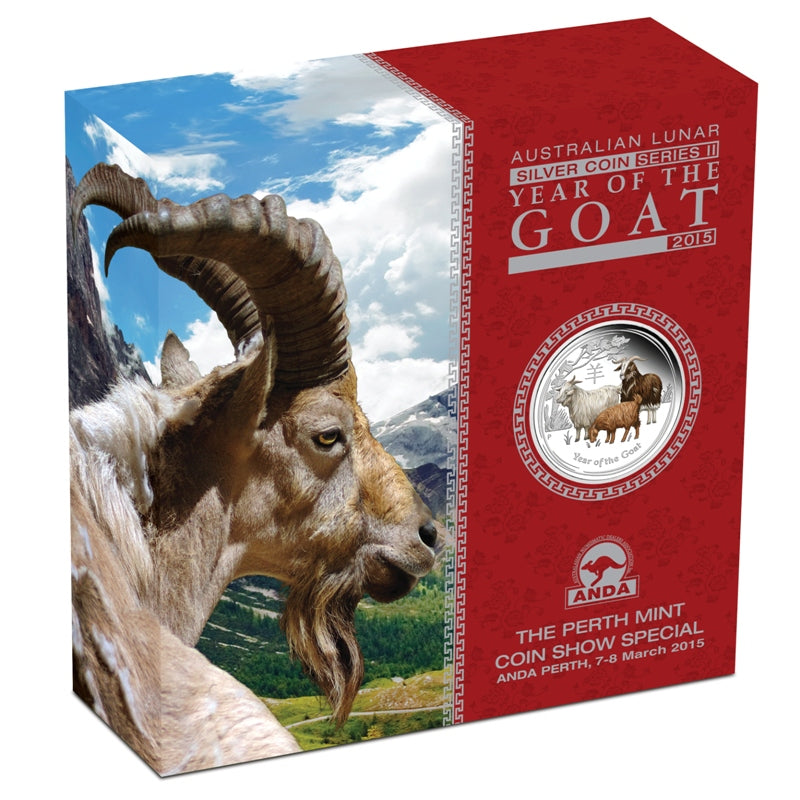 The 2015 Perth ANDA Coin Show Special features a limited mintage of only 1000 Australian Year of the Goat 2oz 99.9% pure silver $2 coloured 55.6mm specimen released by The Perth Mint.