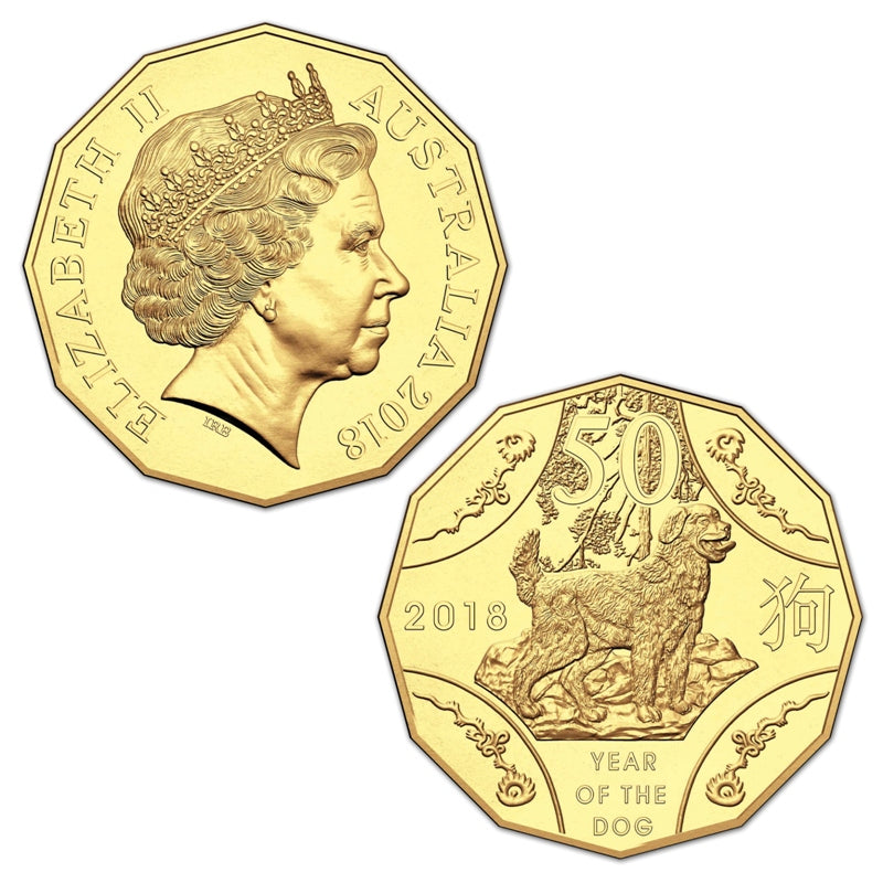 Struck by the Royal Australian Mint and issued at the 2018 World Money Fair held in Berlin Germany this 2018 dodecagonal Lunar Year of the Dog gold plated 50 cent coin has a limited mintage of just 5000 coins.