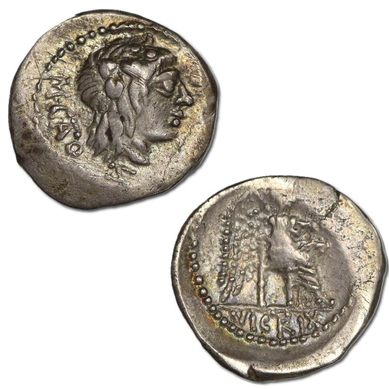 • Obv: Crowned head of Liber right wearing ivy wreath 'M· CATO' behind