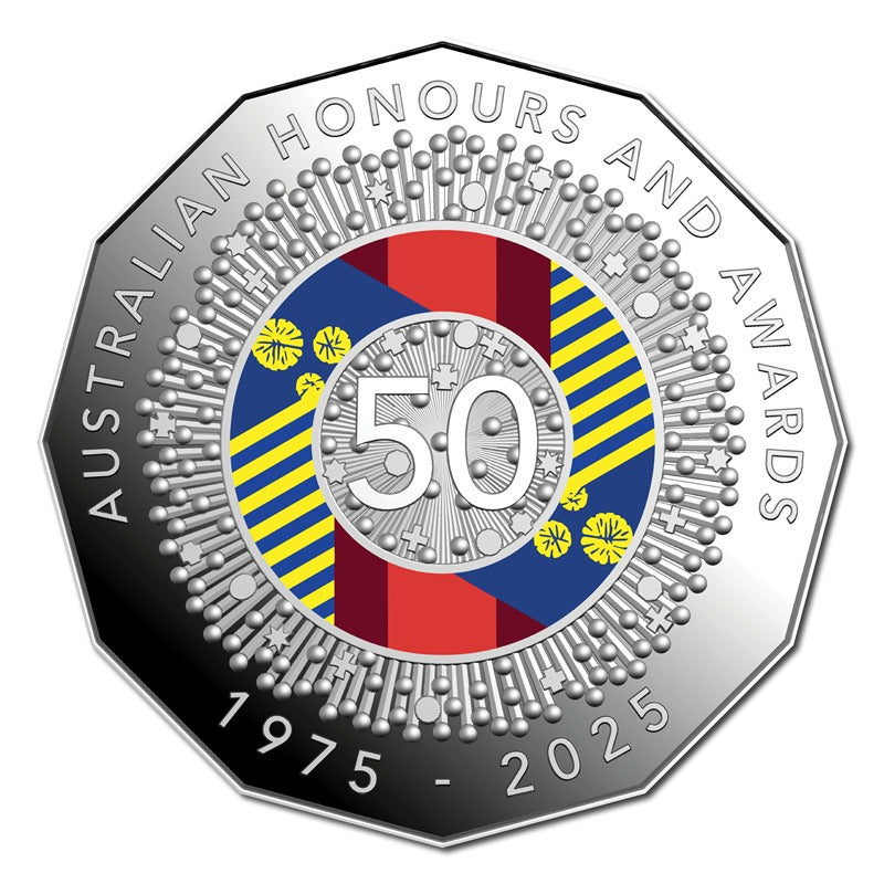 This special six coin proof set includes a coloured 50 cent coin, based on Stuart Devlin's iconic Order of Australia medal, incorporating the ribbon colours of the Order of Australia, Bravery and National Medals