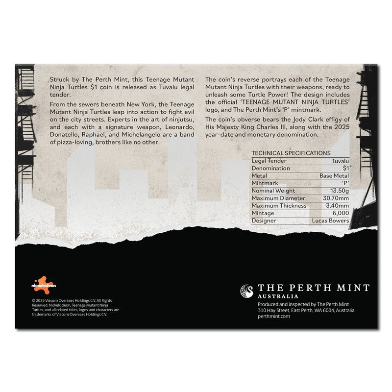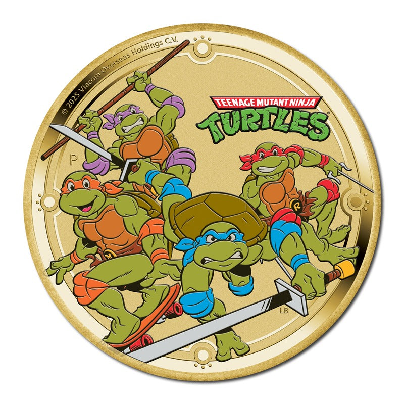 The uncirculated aluminium bronze coin is housed in a TMNT themed card with a circular window revealing the coin’s reverse and obverse designs.