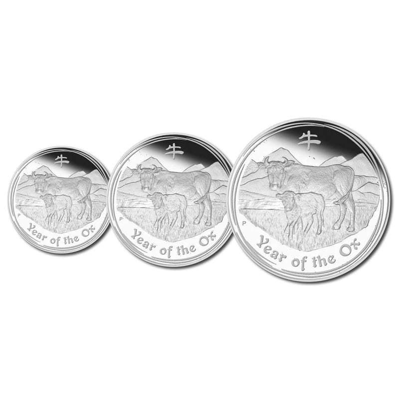 Struck by The Perth Mint from 99.9% pure silver, this 2009 Year of the Ox Lunar Series II set includes the 1/2oz, 1oz and 2oz. Second quality outer cardboard box