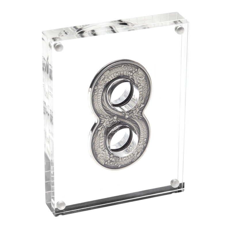 This figure eight shaped coin is the first of its kind in the world innovated by The Perth Mint. In Chinese culture the number eight is considered extremely lucky as the Chinese word for ‘eight’ sounds similar to ? which means good fortune or money. The number eight