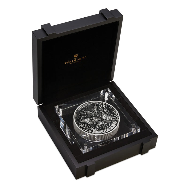 The coin’s reverse portrays three butterflies gracefully pollinating grevillea foliage. Each butterfly is depicted showcasing remarkable and unique markings. As well as a ribbon scroll with the inscription ‘BUTTERFLY’, the reverse includes the coin’s weight, purity, 2025 year-date, and The Perth Mint’s ‘P’ mintmark. The obverse portrays the Dan Thorne effigy of His Majesty King Charles III, and the coin’s monetary denomination.