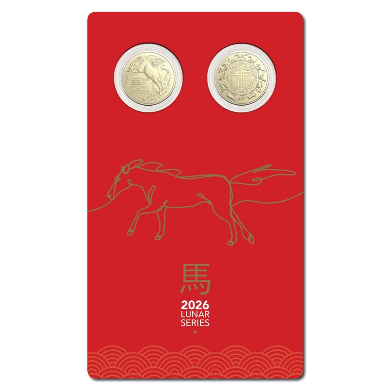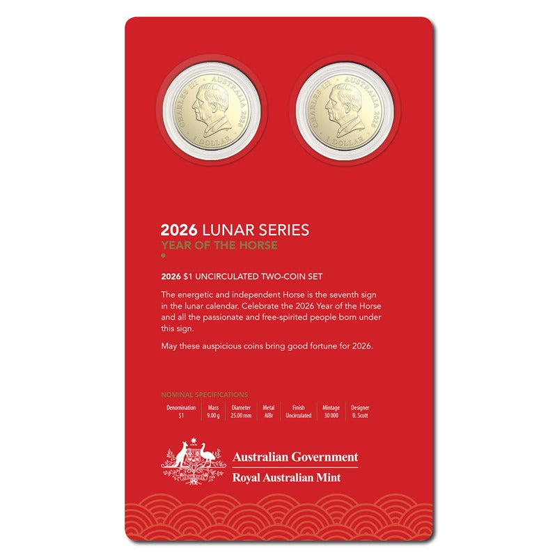 To celebrate the 2026 Lunar Year of the Horse, the Royal Australian Mint has release this $1 uncirculated two-coin set featuring the free-spirited Horse amongst gingko leaves. The second coin's reverse depicts the lunar calendar wheel, rotated so that this year the Horse takes pride of place.