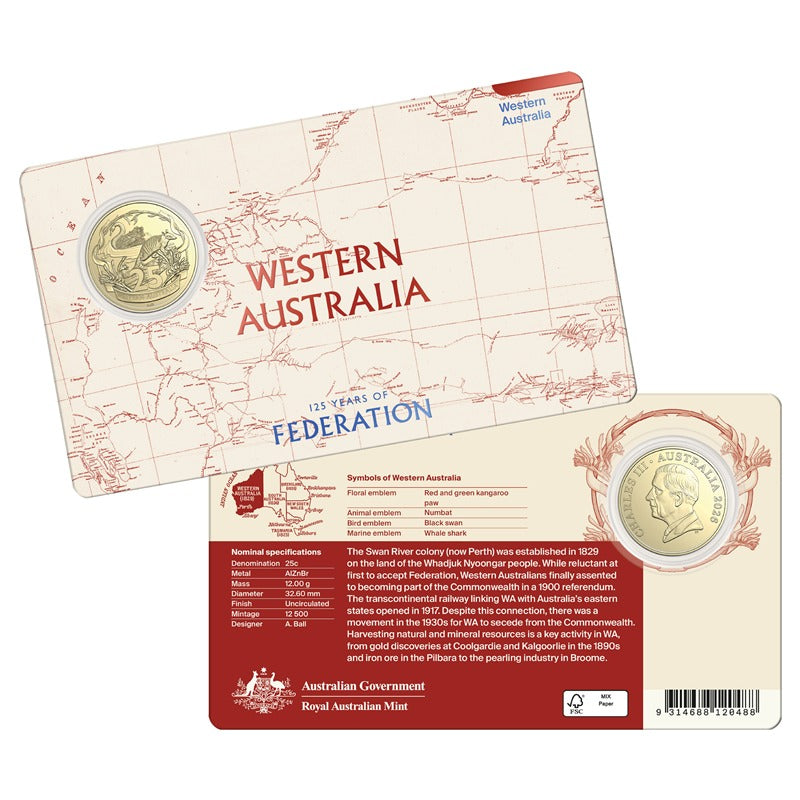 Each 25c state coin showcases distinctive floral and faunal emblems, while the $1 Commonwealth coin completes the collection. The New South Wales and South Australia designs also acknowledge the Australian Capital Territory and Northern Territory, which were part of those states at the time of Federation. All coins feature the Daniel Thorne effigy of His Majesty King Charles III.