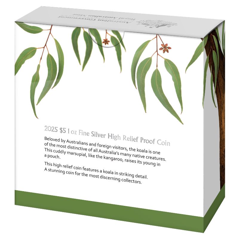Australia's beloved koala is the hero of thie Fine Silver High Relief Proof Coin as part of the Royal Australian Mint's 2025 Koala Series.