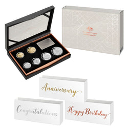 Each set includes six circulating coin designs in an exquisite proof finish an engravable plate for the addition of a personalised message and your choice from nine different bands* to honour the specific celebration.
