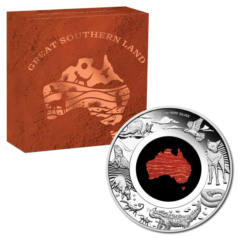 Celebrating Australia’s iconic desert species, the coin depicts (clockwise from top) a cockatoo, a dingo, a taipan snake, a thorny devil, a desert ant, a scorpion, a bilby, a bearded dragon, and a rock wallaby. Also in the design are representations of the sky, sand and rocks, along with The Perth Mint’s ‘P’ mintmark and the coin’s weight, purity, and 2025 year-date.
