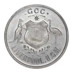 - Reverse: 7 Pointed star below 'GCC' German Concentration Camp, LIVERPOOL. N.S.W. Coat of Arms kangaroo on left and emu on the right and wreath below