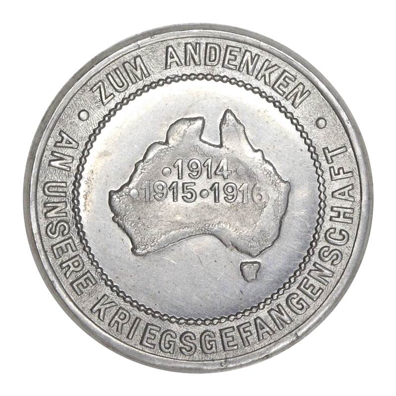 - Obverse: The German inscription around the map of Australia reads: ZUM ANDENKEN AN UNSERE KRIEGSGEFANGENSCHAFT. Dates 1914, 1915, 1916 appear in the centre
