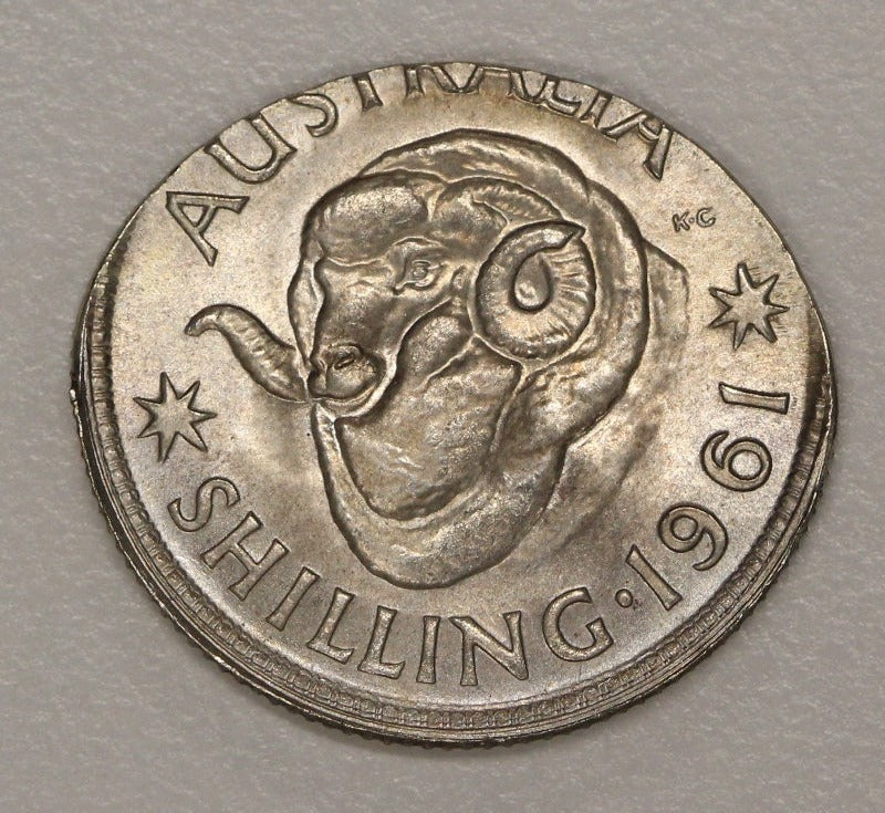 Ram's Head - Design by George Kruger Gray. Legend: AUSTRALIA - SHILLING . 1961 Alternate large & small rim beads (100 of each). |