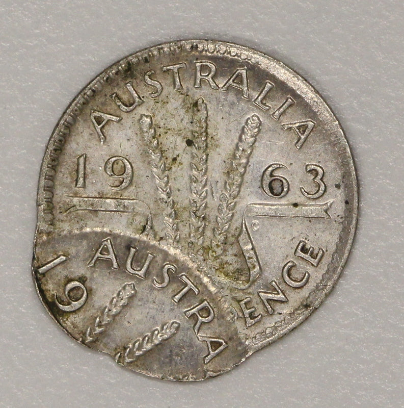 | Reverse | Wheat stalks & Ribbon - Design by George Kruger Gray. Legend: AUSTRALIA - THREE PENCE - 1963 Alternate large & small rim beads (83 of each). |
