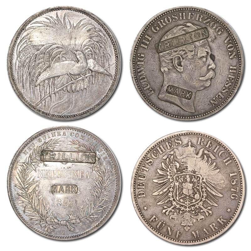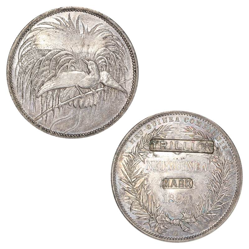 - One Trillion Mark Counterstamp on German New Guinea 1894 Silver 5 Marks