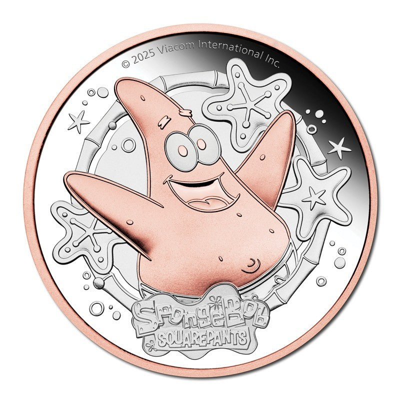 The coin portrays a cheerful portrait of Patrick Star. The image along with the coin’s rim are gilded in stunning 22-carat pink gold. The background showcases illustrations of star fish with an array of playful motifs. Included in the design is the official ‘SpongeBob SquarePants’ logo. Accompanied by a numbered certificate of authenticity, the coin is housed in a brightly illustrated shipper and a presentation case that represents Patrick’s house in Bikini Bottom.